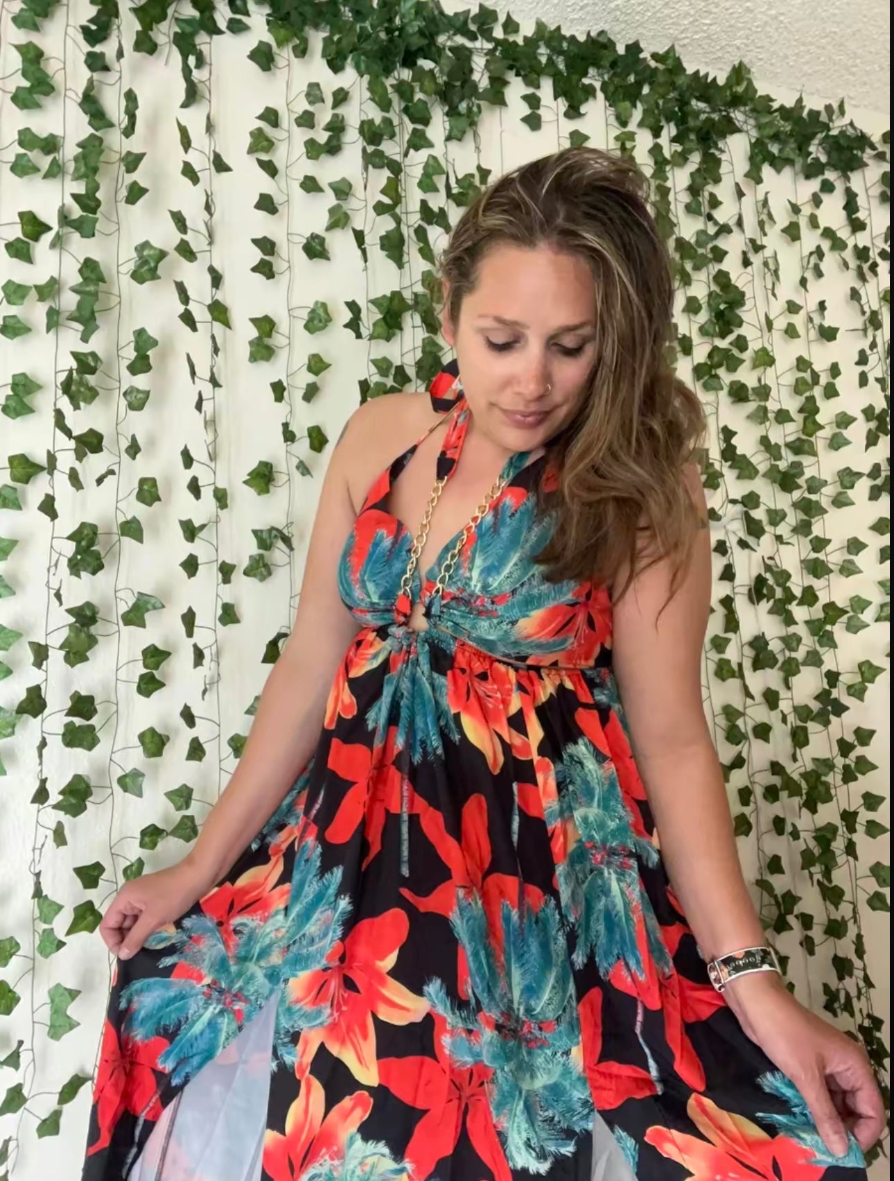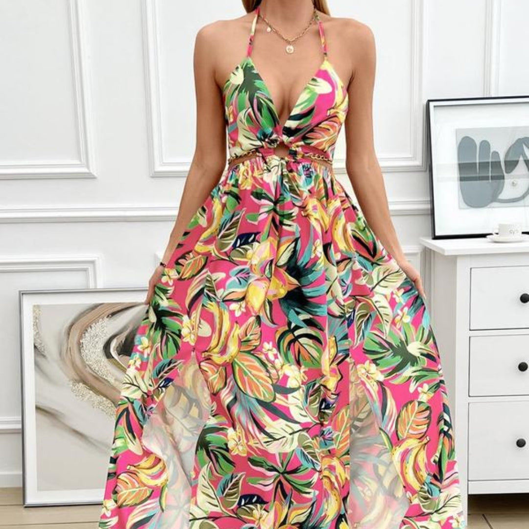 El corte comienza justo debajo del busto, lo que alarga visualmente el torso y permite que el resto del vestido caiga suavemente sobre el abdomen, las caderas y piernas. El largo tipo maxi estiliza verticalmente, y el escote cuadrado con tirantes finos aporta un look delicado y moderno, perfecto para todo tipo de cuerpo.