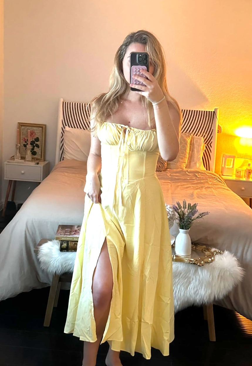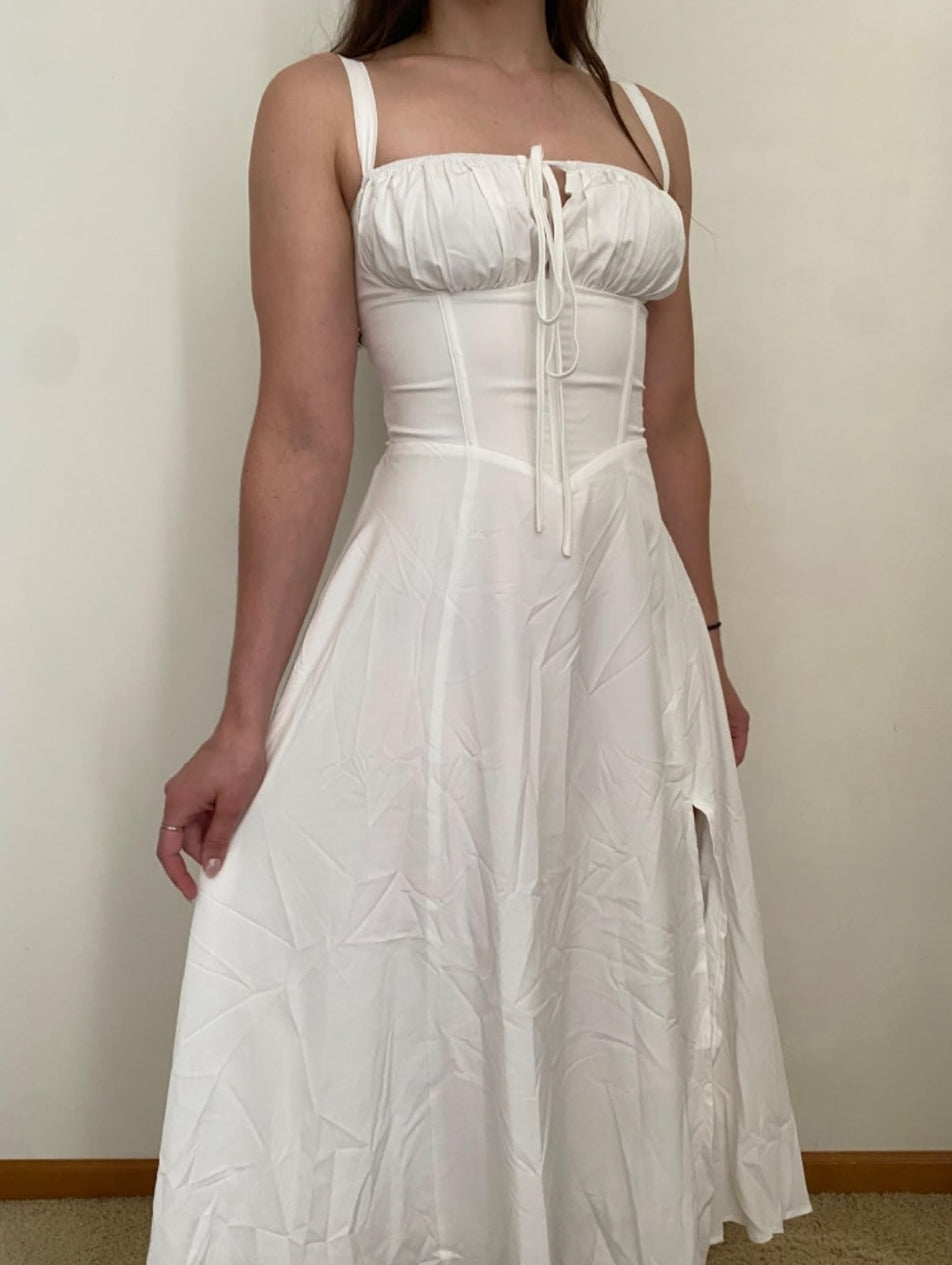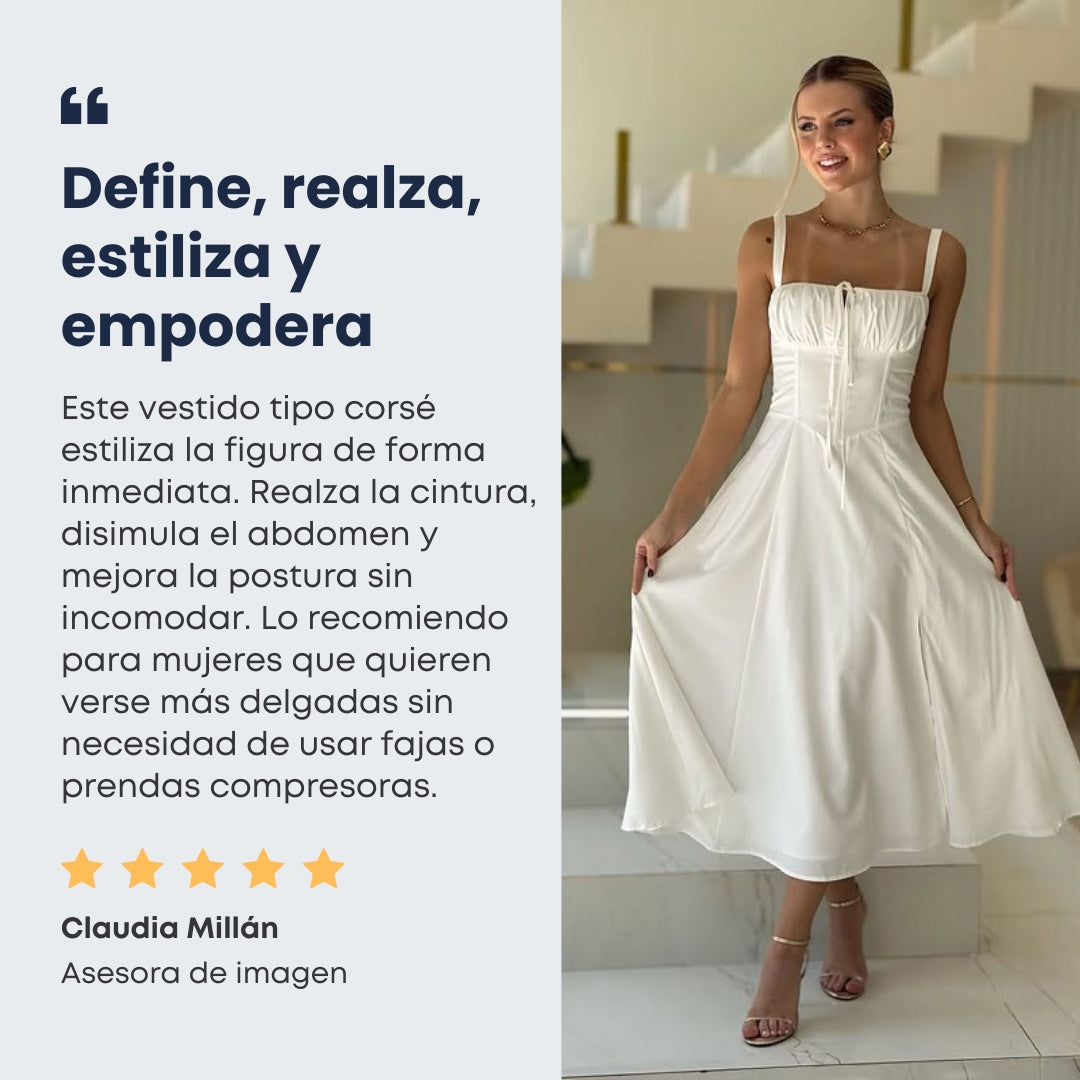 Diseñado con una estructura tipo corsé y abertura lateral, este vestido se ajusta suavemente al cuerpo, realzando tu figura natural, afinando la cintura y disimulando el abdomen. Ideal para cualquier tipo de cuerpo, este diseño favorece la postura, alarga visualmente las piernas y te da una confianza instantánea.
